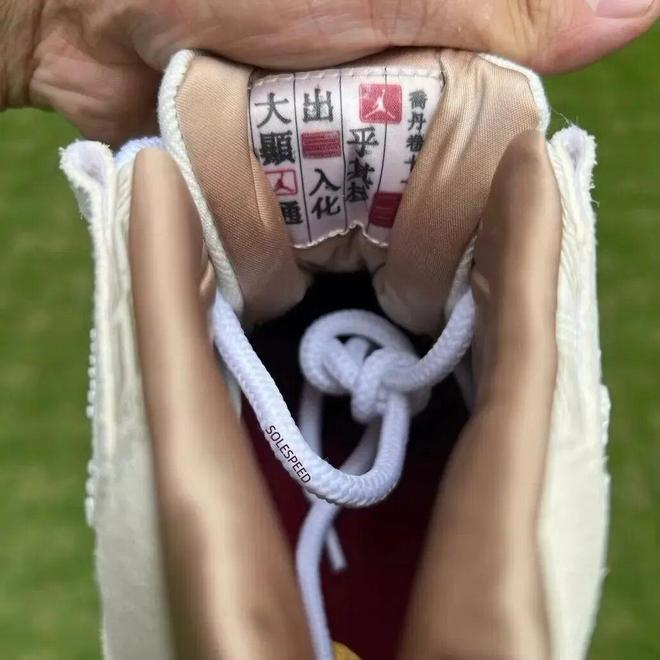 最新展示鞋舌内的贴布还能看到特殊的中文细节,依旧是魔改的古文,看得出这团队就没换过人,不是换成语,就是改谐音古文。。。长久来,一直如此。